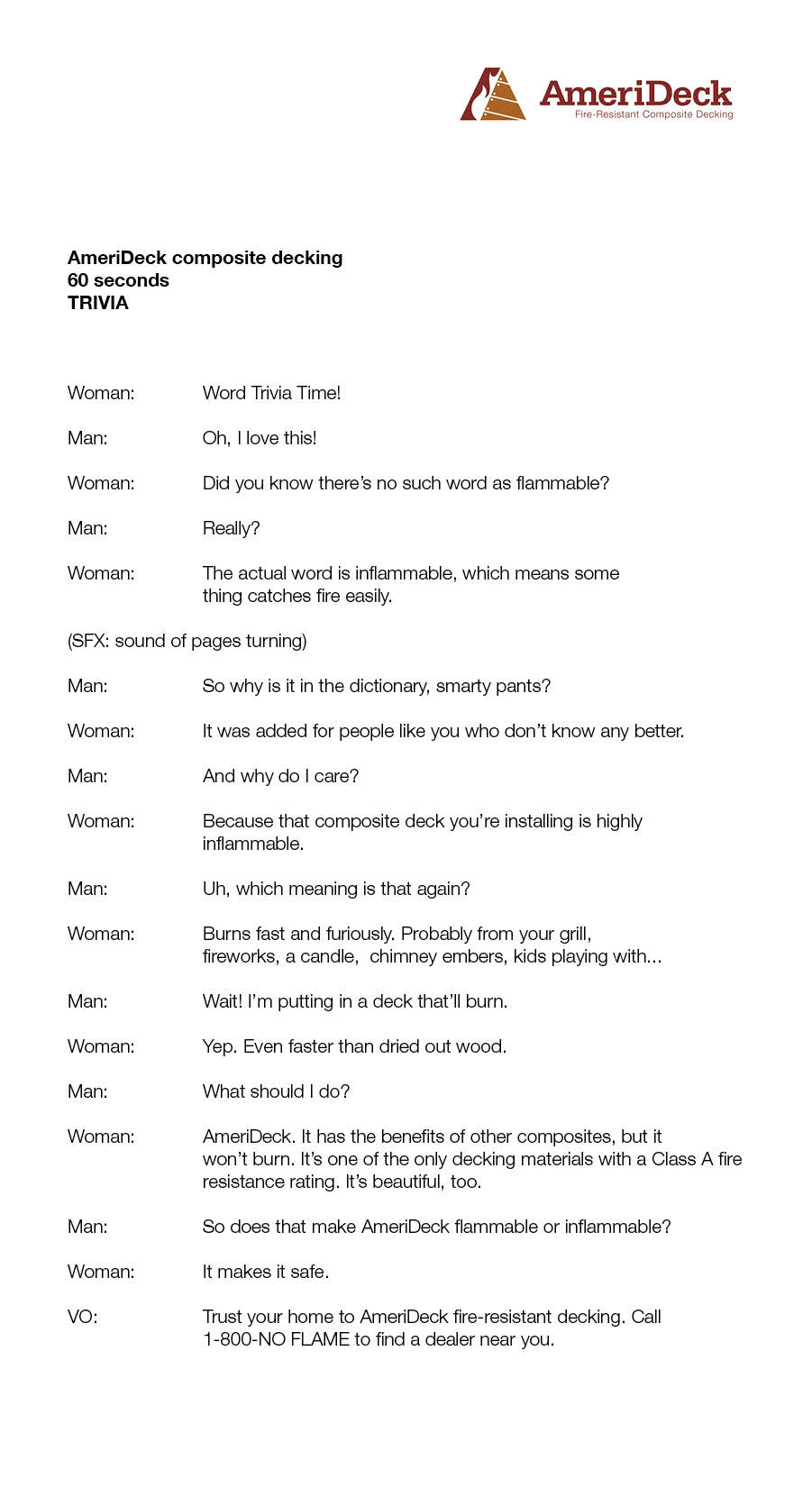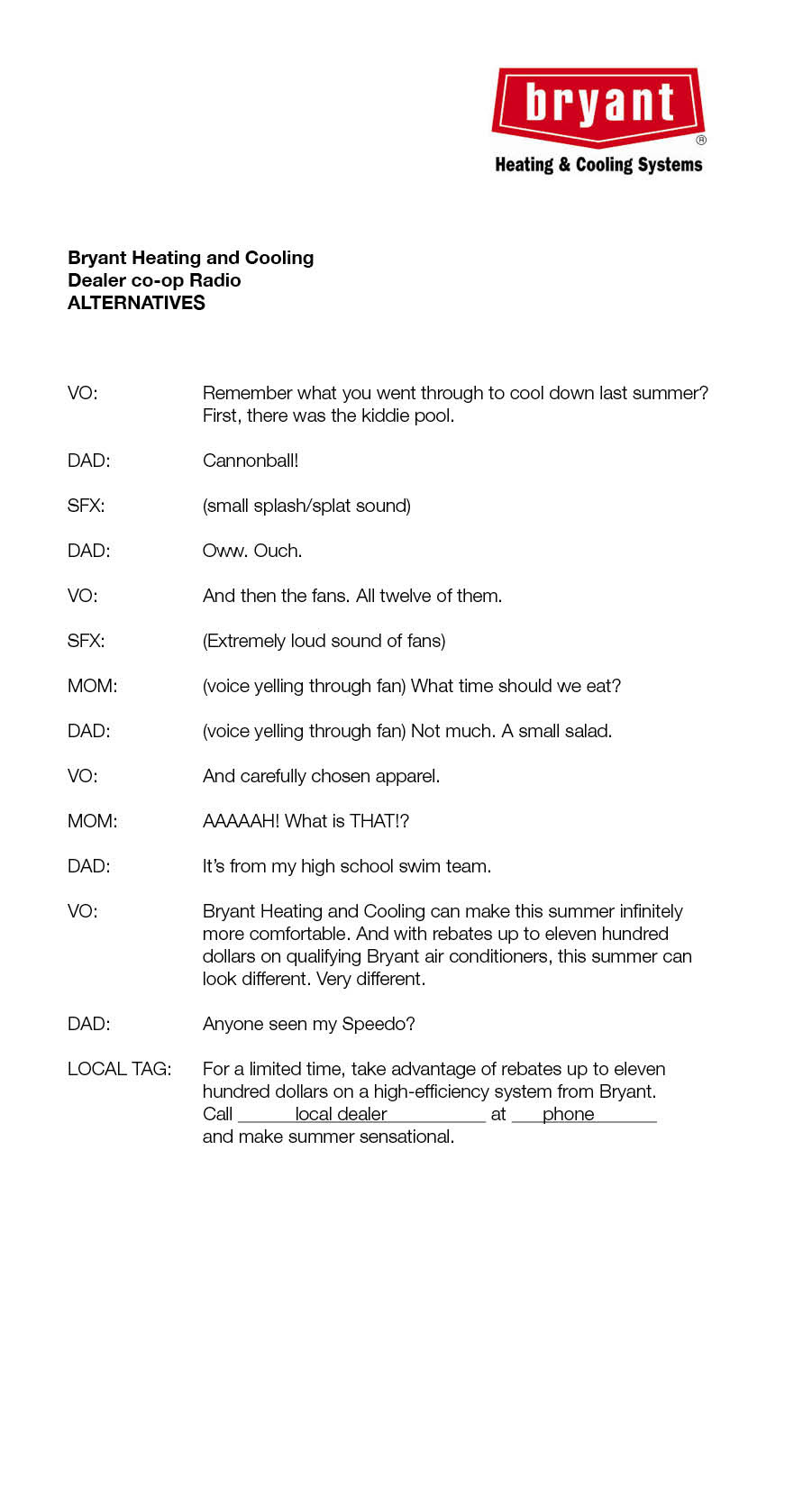 Radio Scripts for • Amerideck • Eddie Bauer • Sharp Solar • Bryant Heating and Cooling • First Mutual Bank